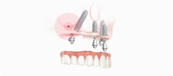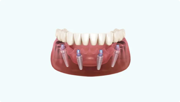 Для восстановления зубного ряда на одной челюсти используем всего четыре имплантата. Два устанавливаем вертикально в передней части челюсти. Ещё два — под углом в боковом отделе, в местах с наибольшим объёмом костной ткани — это даёт протезу надёжную опору. После установки имплантатов фиксируем несъёмный протез