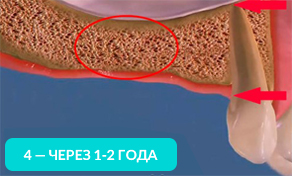 На рисунке 4 видно, что костная ткань стала значительно тоньше, теперь в это место уже невозможно установить импланты (потребуется операция по наращиванию костной ткани). Обратите внимание, насколько тоньше стала кость на рисунке 4, как постепенно обнажается корень оставшегося зуба.